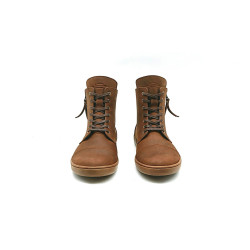 Version made of brown fatty leather. Lined in black leather. Metallic zipper. Bronze eyelets. Brown waxed cotton shoe laces. Brown stitched rubber sole.